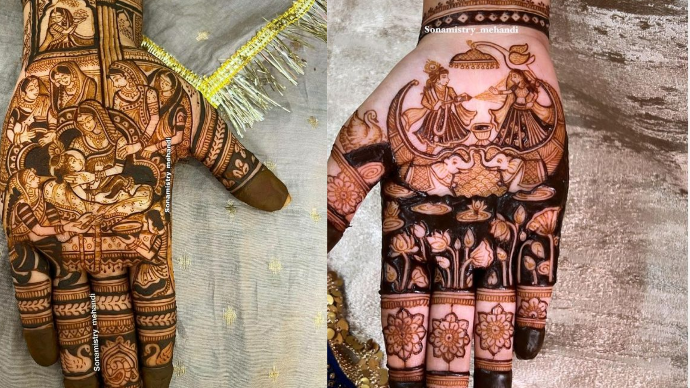 This stunning mehndi design captures a joyous dance scene with intricate details and floral patterns.So,it’s ideal for weddings and celebrations, adding a touch of tradition and elegance to your hands.